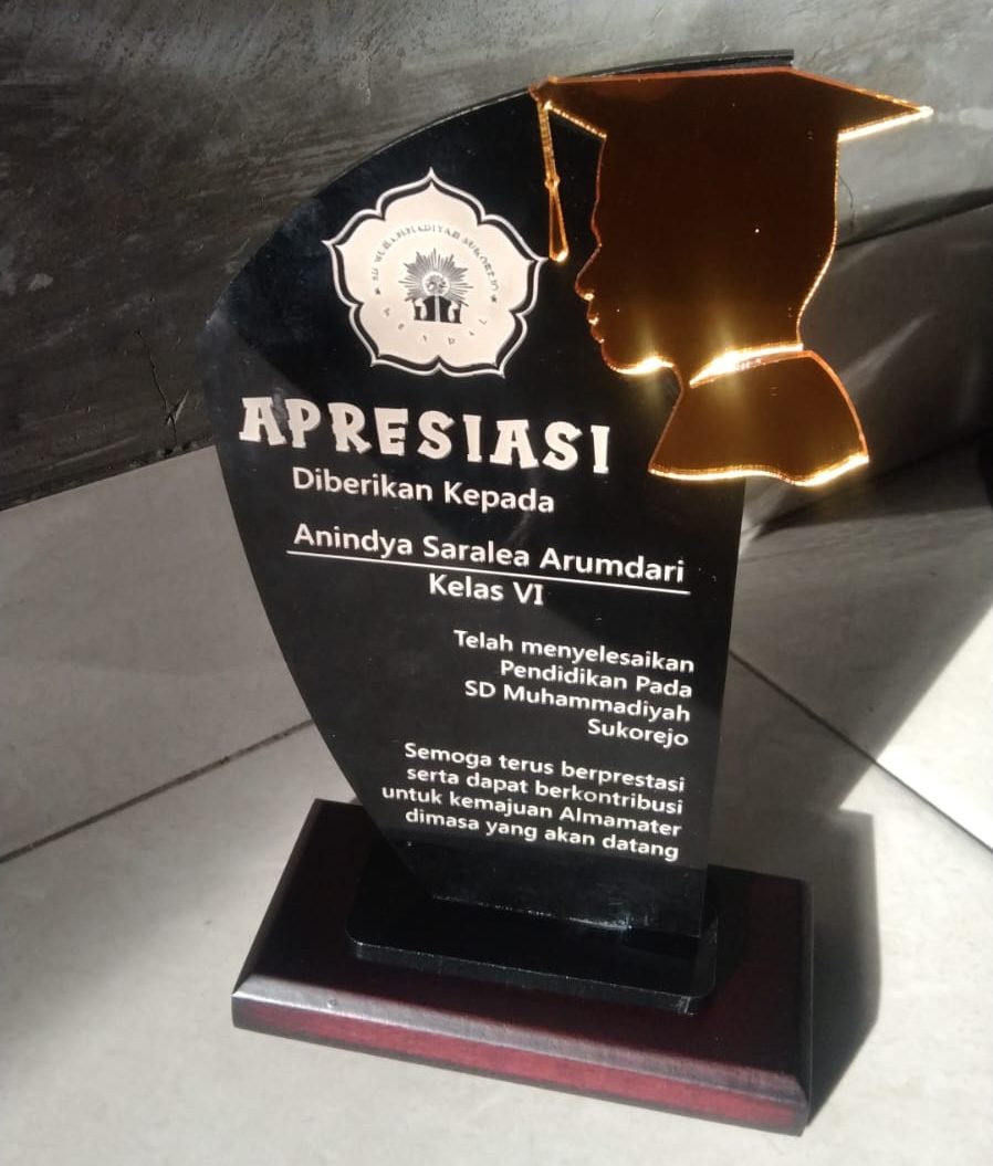 Terbuat dari bahan akrilik dengan tebal 2 mm yang dipotong potong lalu digabung menjadi kesatuan sehingga terbentuk plakat modern dengan desain yang anda inginkan.